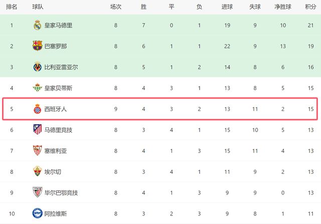 本场过后,西班牙人在前9轮西甲,已经足足拿到15分。在目前的积分榜上,他们多赛一场,积分已经追平了第四的贝蒂斯,排名上前五,甚至还领先马竞2分。本赛季,西班牙人已经成为西甲超级大黑马,如果能继续保持这样的抢分势头,他们随时有机会竞争一个欧战席位。
